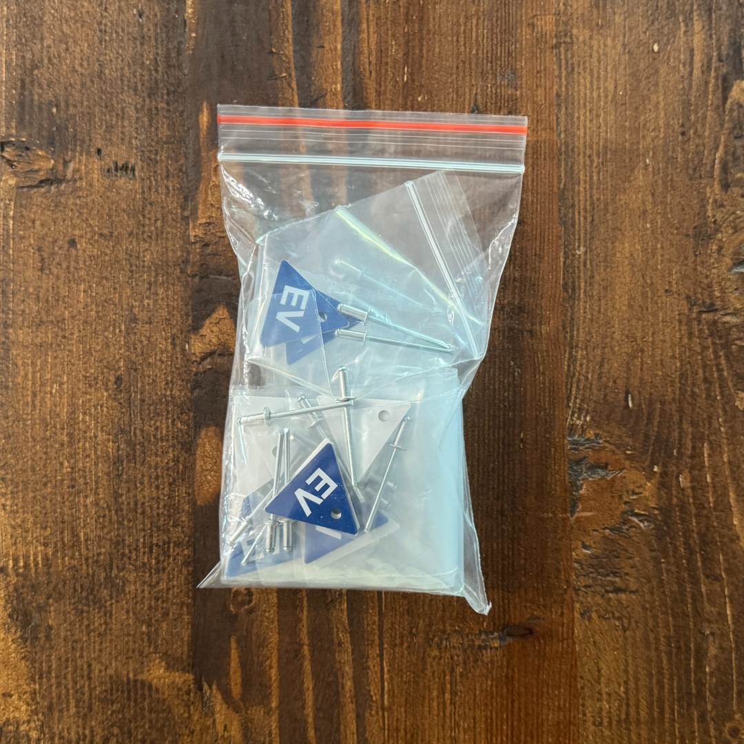 Compact size — 30mm each side, 1mm thick, EV lettering 8mm tall. Rivet or self-adhesive.
